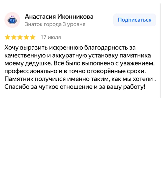 Эти отзывы помогут вам понять, как купить памятник, как мы работаем, и принять верное решение, где заказать памятник или мемориальный комплекс для родного человека. Увидев, что люди доверяют нам изготовление памятников на могилу и мемориальных комплексов, вы сможете заказать памятник в Тюмени недорого с уверенностью в надежности производителя.
